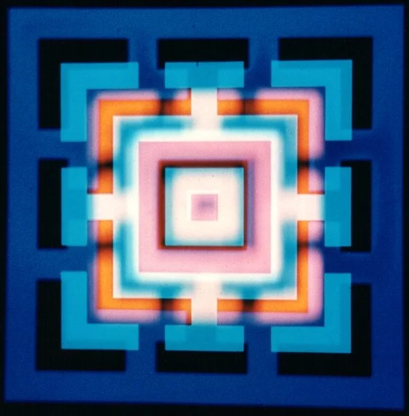 Boreham also made a circular installation “Ranismala” for the Buddhist Vihara, which radiates a diffuse white light in a halo behind a Buddha Statue. There are several artworks from this period that utilise polarisation of light in “compositions on four planes” and “compositions in a mirror cube” in a constructivist style. While doing his degree course in Wimbledon, Boreham studied Theravada Buddhism under the Venerable K. Piyatissa Thera at the London Buddhist Vihara. His regular visits to the Vihara were the beginning of a life-long interest in Buddhist psychology and philosophy. We see the Buddhist influences in Boreham’s Yantra and Ranismala, which in fact have western constructivist design.